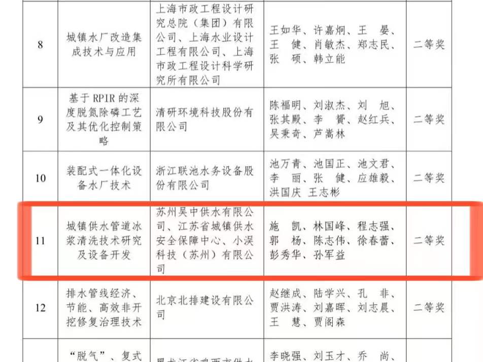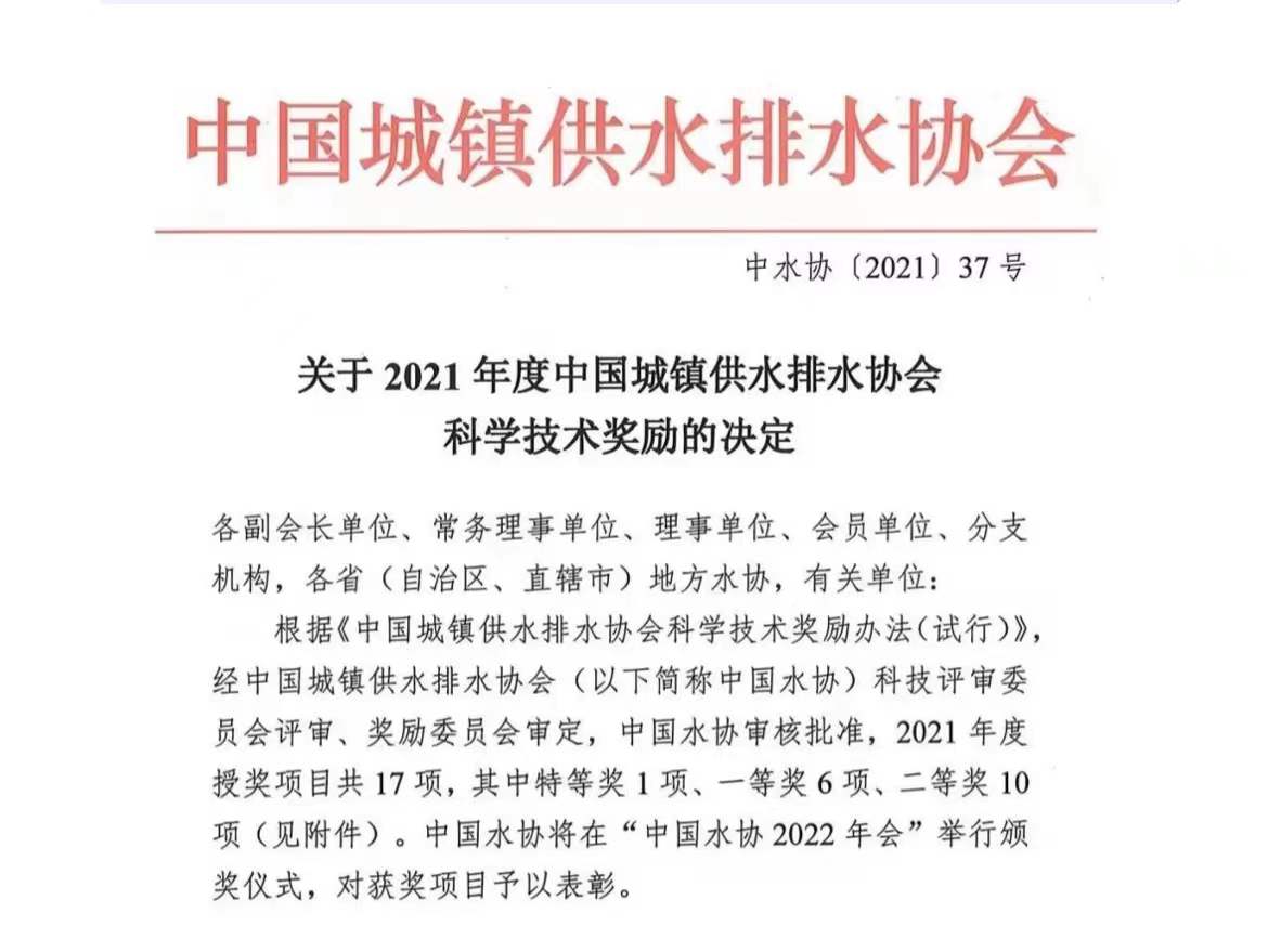 我司“城鎮供水管道冰漿清洗技術研究及設備開發”項目喜獲“2021年度中國城鎮供水排水協會科學技術獎”二等獎和“2021年度江蘇省建設科技創新成果”三等獎。