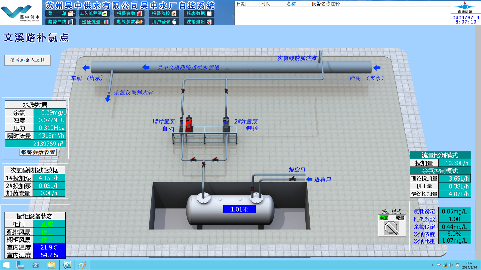 借助智慧水務平臺,管理人員只需在運控中心就能夠?qū)ΜF(xiàn)有的三處管網(wǎng)補氯裝置進行實時監(jiān)測和遠程操作。例如,在線監(jiān)測儀會實時回傳各項數(shù)據(jù),也可以遠程查看箱體內(nèi)情況(包括余氯、流量、消毒劑投加量等)。與此同時,補氯點將會對消毒劑的投加量進行自動計算和控制,工作人員也能手動調(diào)整各項參數(shù),確保系統(tǒng)運行的準確性。