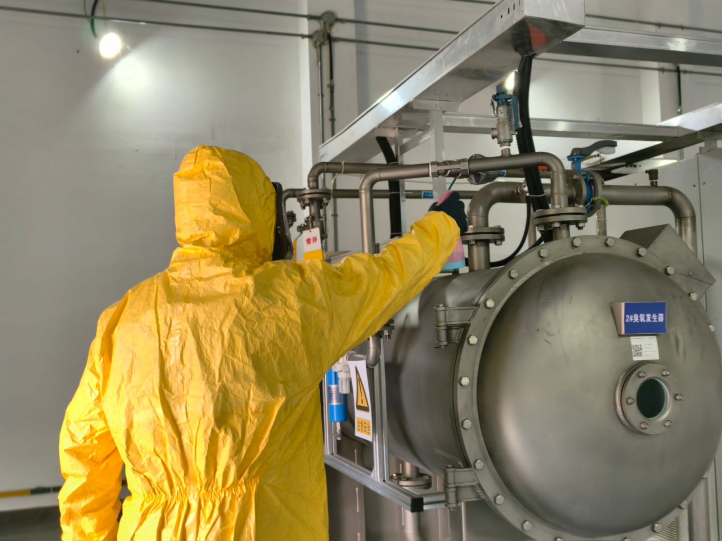 反恐演練結束后,隨即轉入臭氧泄漏應急處置科目。根據警方現場突審信息,一名入侵人員疑似破壞臭氧制備車間設備導致泄漏。水廠工作人員立即穿戴專業防護裝備趕赴現場核查,并啟動《臭氧泄漏應急預案》。搶險處置組迅速關停臭氧發生器,對現場實施封鎖并設置警示標識;警戒疏散組快速劃定警戒區域,嚴防無關人員進入危險地帶。經專業維修人員緊急搶修,設備泄漏問題順利解決,整個演練流程銜接緊密、處置規范。